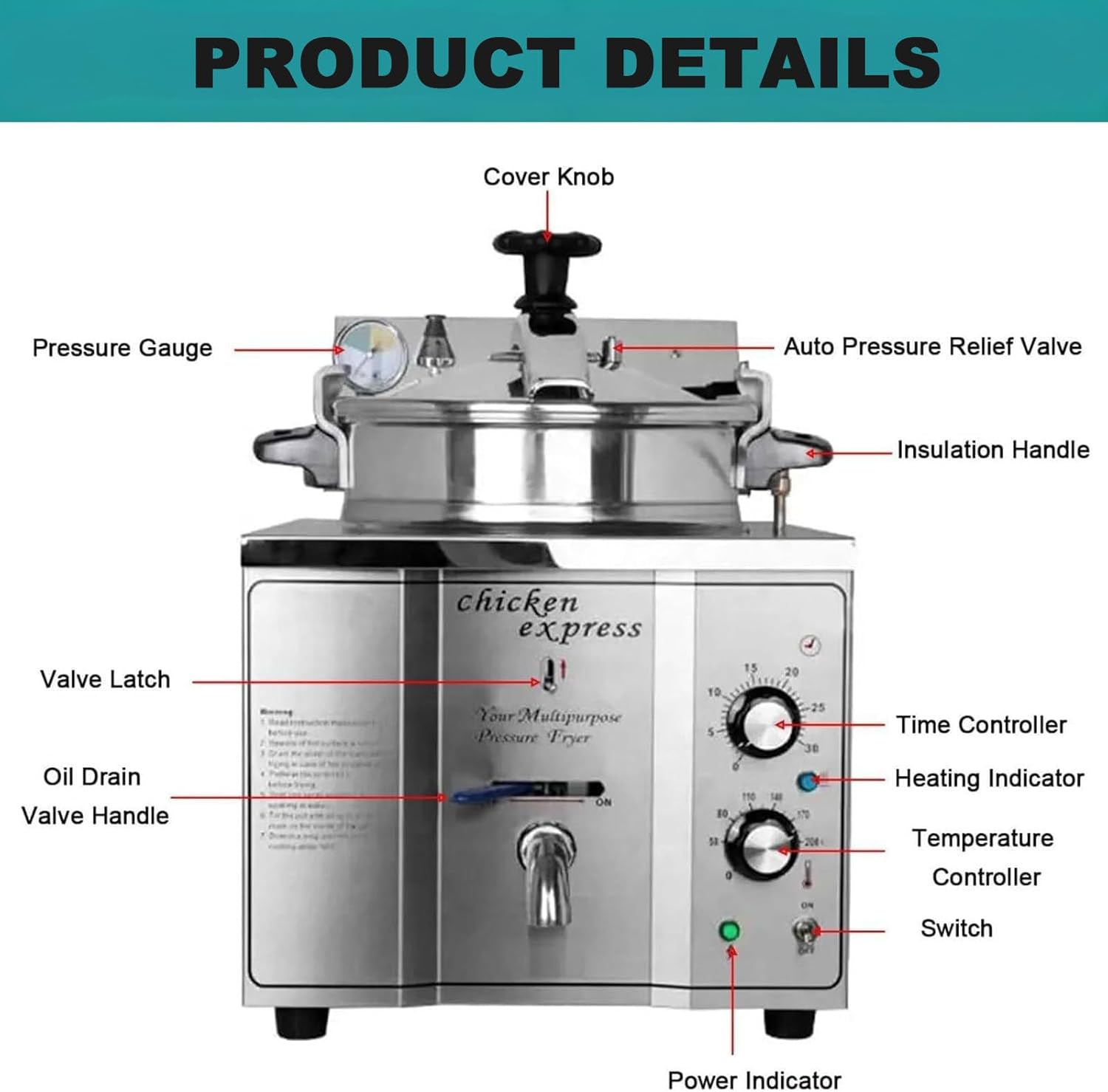 Unlock the secret to incredibly crispy, juicy fried chicken and more with this high-capacity countertop pressure fryer. Designed for efficiency and consistency, this 3000W powerhouse combines rapid heating with pressure cooking technology to seal in flavor and reduce cooking time. Ideal for busy restaurants, food trucks, or dedicated home chefs seeking professional-grade results.