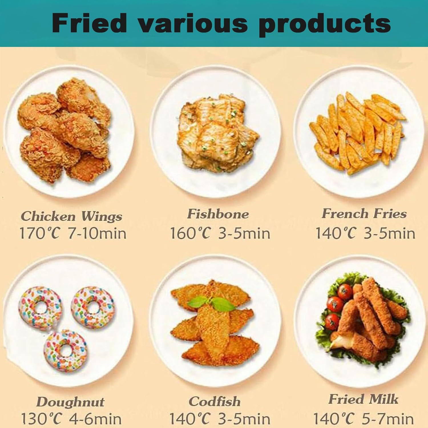 An adjustable thermostat allows you to set the perfect frying temperature (50°C to 200°C) for different ingredients, from delicate seafood to hearty chicken and fries.