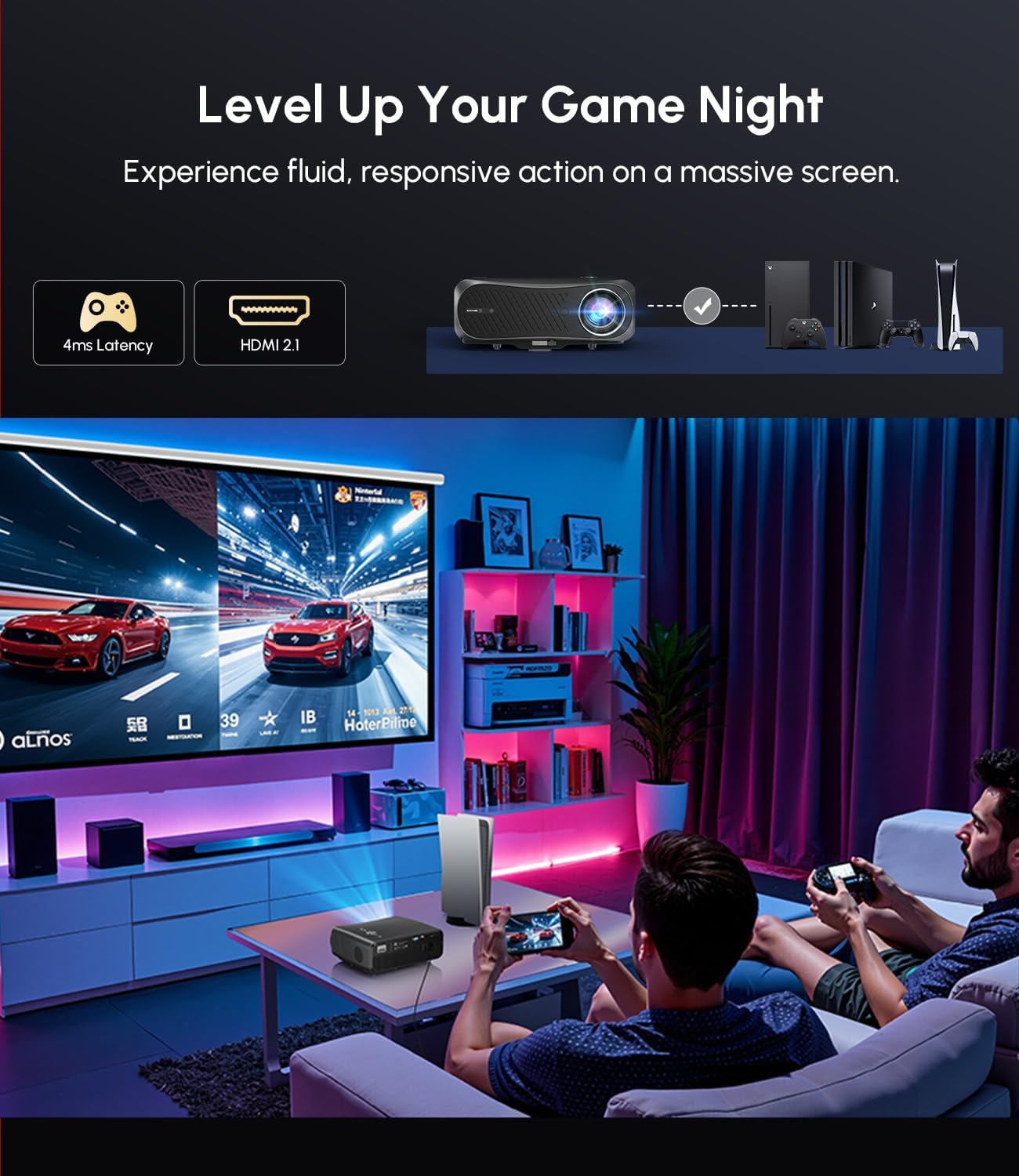 Cheer for goals with friends on a colossal 200″ display. Stream live sports through Google TV , sync reactions with zero latency—perfect for beer, banter, and victory toasts