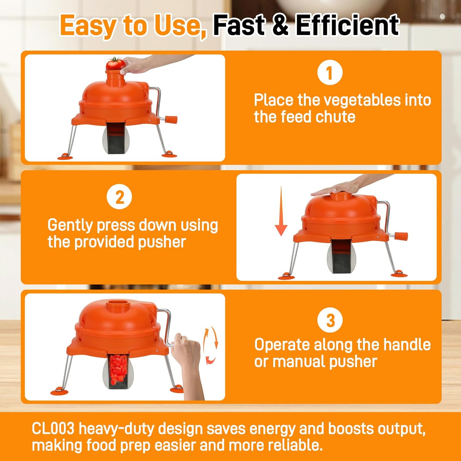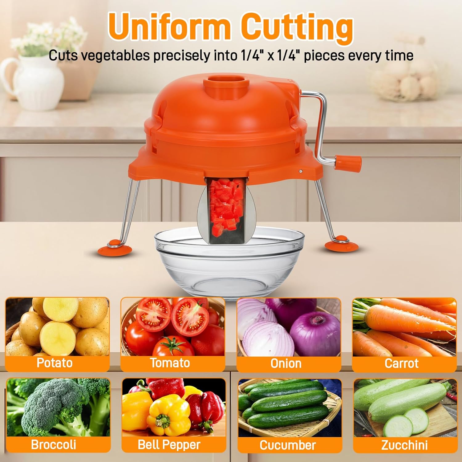 Features a manual, non-electric design with an ergonomic handle. The “guide + fixed-cut” mechanism is intended to minimize repetitive motion, allowing you to push prepared vegetable strips through for quick dicing.