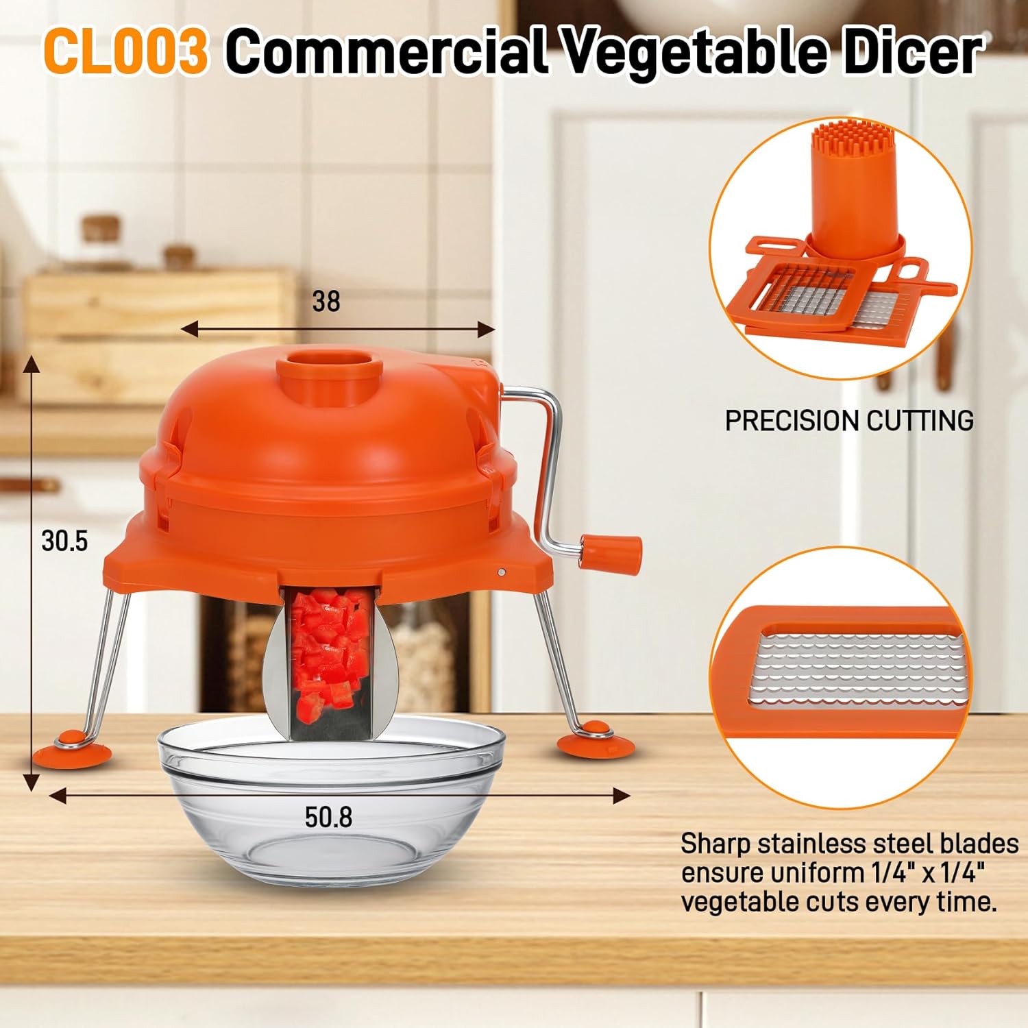 Engineered to dice medium-firm vegetables like potatoes, carrots, and onions into consistent 1/4″ x 1/4″ cubes. This design aims to ensure professional, standardized presentation and portioning for large-batch preparation.
