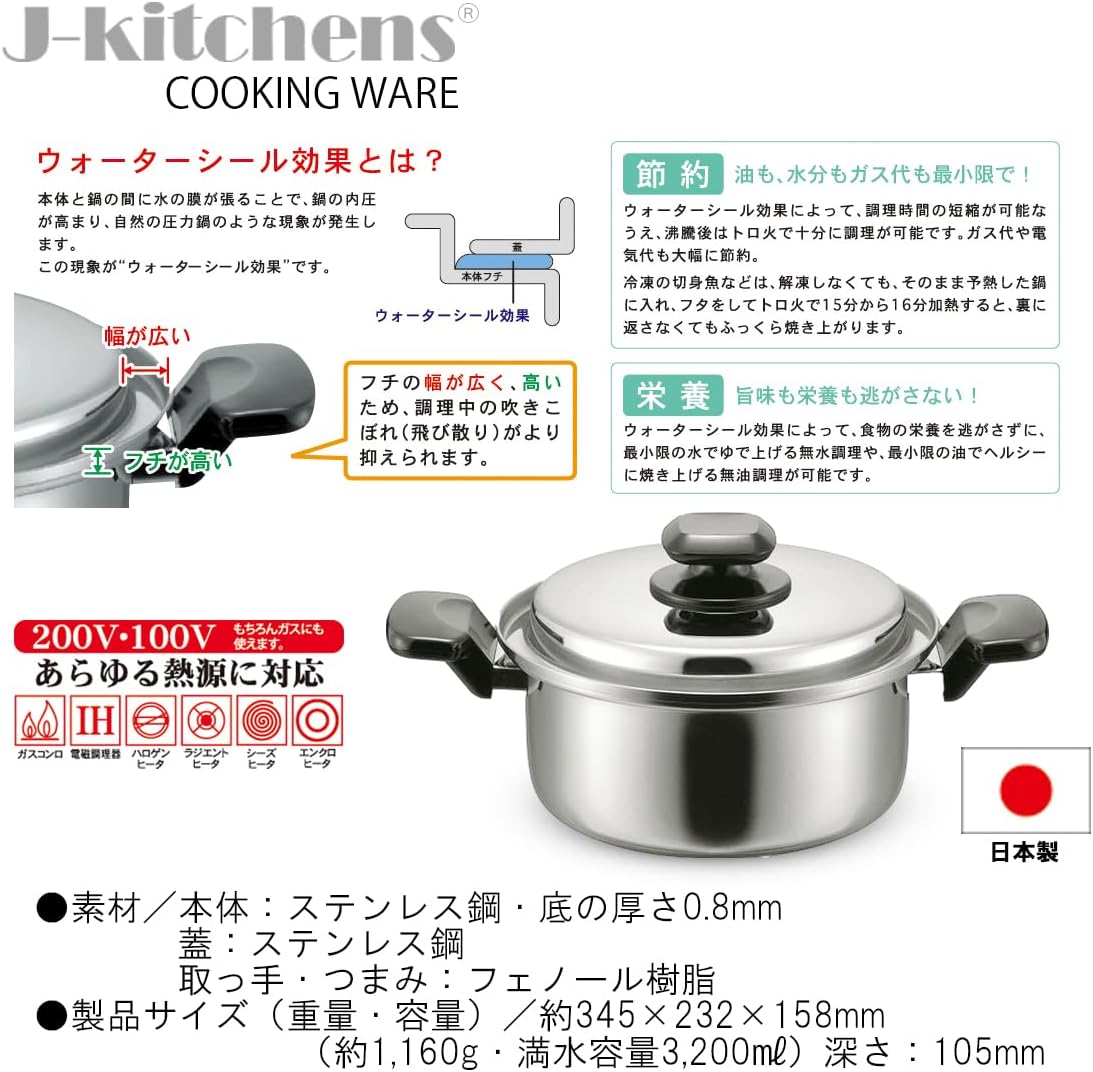 J-kitchens Dining Table Interior Two-Handled Pot, Water, Healthy Function, 7.9 inches (20 cm), Gas Induction Compatible, Made in Japan, Original Tag Included