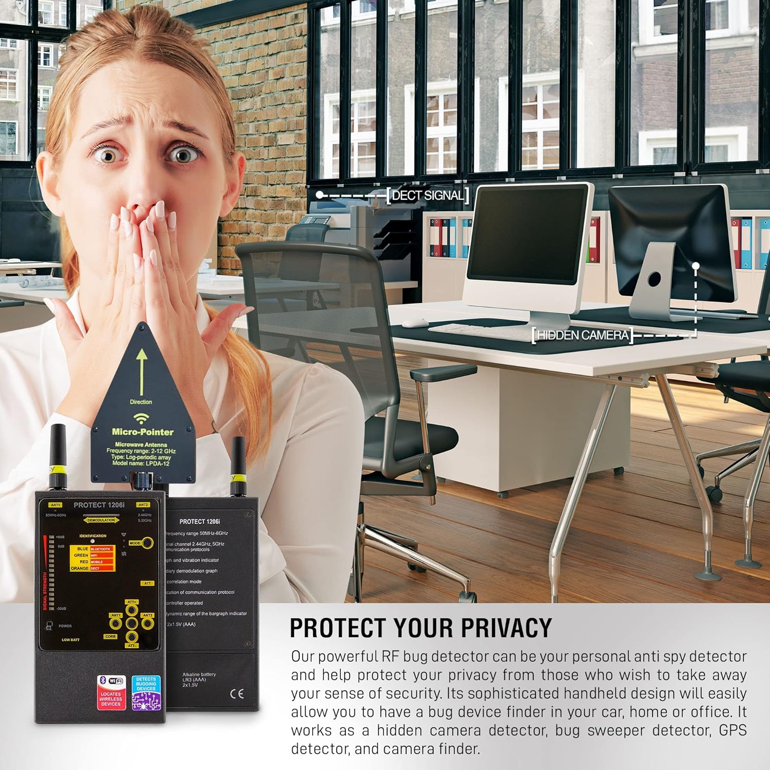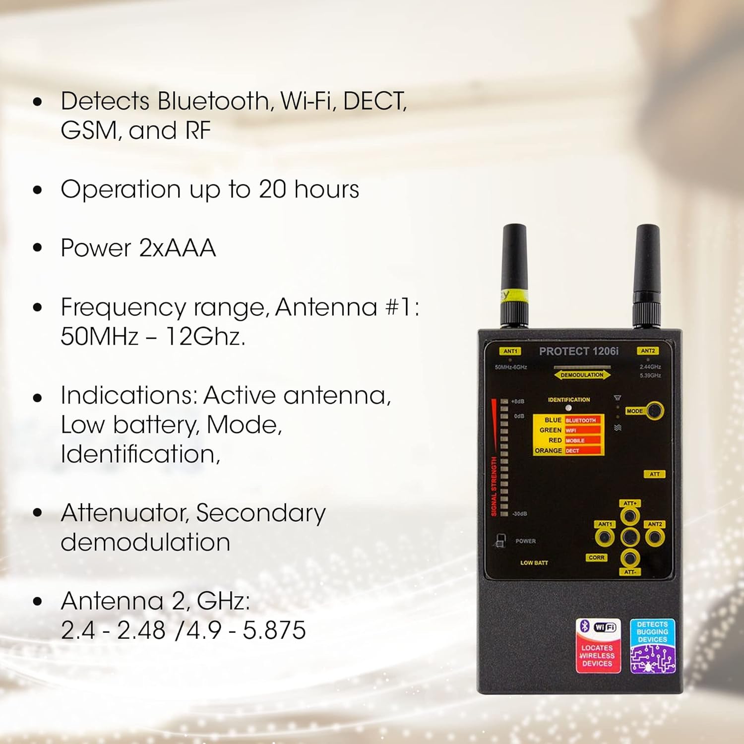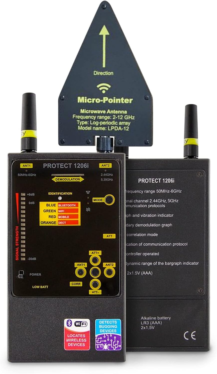 The Protect 1206i RF detector can help protect your privacy. This electronic gadget helps keep you safe whether at home, at the office, or in your car. The built-in hidden cam detector can also be used to sweep anywhere for Bluetooth or WiFi cameras. Additionally, track GSM transmitters, any active wireless radio frequency, and audio recording/listening bugs.